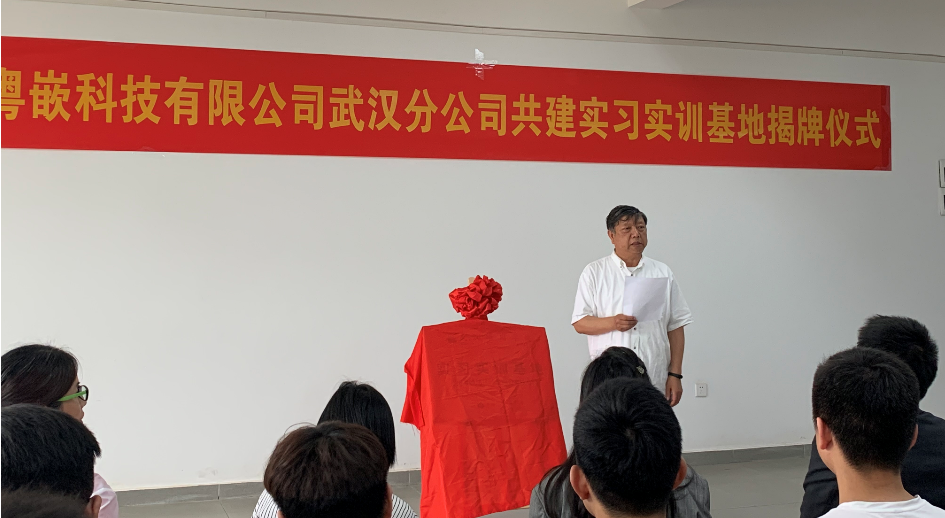 公司向巍副董事长和广州粤嵌科技有限公司武汉分公司吴星星董事长代表校企双方揭牌。仪式由电子信息工程学院经理田茂主持。武汉分公司校企合作经理梁霖波、电子信息工程学院教师和员工代表参加了揭牌仪式。