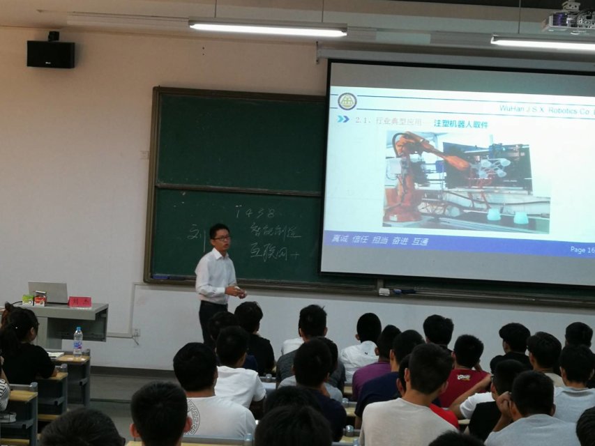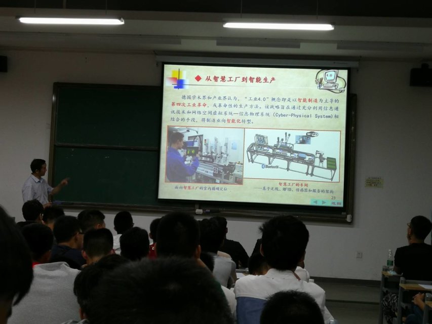 13日上午8:30和10:00在教1-109分别举行了“机械电子工程(工业机器人实验班)”和“电子信息工程技术(工业机器人实验班)”的专业讲座。系主任潘卫平老师和金石欣企业合作导师刘杰工程师(简称“刘工”)对专业课程设置、专业研究现状、制造工业现状等进行了介绍。其中潘主任还介绍了四次工业革命,重点介绍了“工业4.0”即以智能制造为主导的第四次工业革命,实现网络智能化生产、虚实融合,工业化和智能化相结合的互联网+时代。刘工则从机器人的行业现状、行业应用、人才需求、人才培养、就业等方面进行了介绍,播放“工业机器人”的工作操作视频,让员工对“工业机器人”有了更深入的认识与了解。