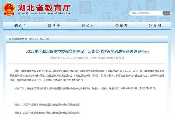 湖北省教育厅发布《2015年度湖北省高校校园文化建设、网络文化建设优秀成果评选结果公示》,公司在2015年作为学校唯一入围参评申报的《厚基础 宽口径 强能力 打造创新实践育人平台——武大珞珈学院电机学院“联创”电子协会探索与实践》项目,获2015年度湖北省高校校园文化建设优秀成果三等奖。