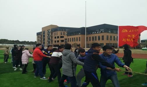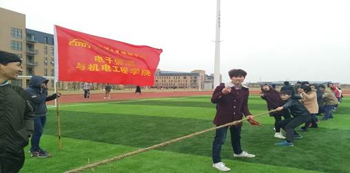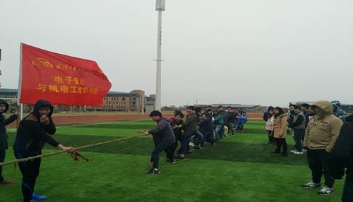 第二个环节是拔河比赛。由于理工科女生特别少,活动安排每班15名男生参赛,女生上场可2名顶替一名男生。参赛队员都积极布阵,安排人员,还没开始都已经将浑身的力气传递到了拔河绳上。哨声一响,大家都拼尽全力,劲往一处使,都想成为学院的佼佼者。一旁的同学也都兴致勃勃,“一二加油,一二加油……”欢呼声不断。有的班级势均力敌,只见决定胜负的绳子上的红绳左右移动。最终2014及通信2班和2015级机电2班分别获得了本年级的冠军。