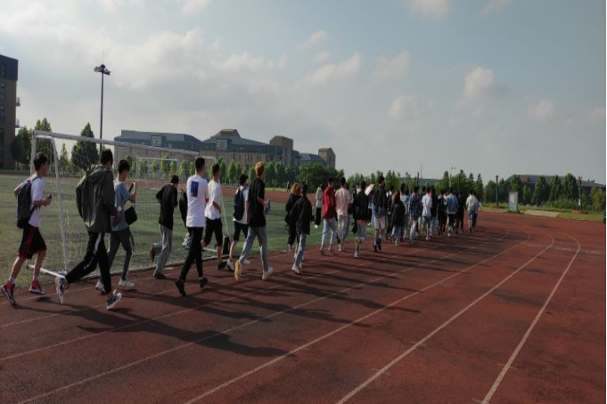 升旗仪式结束后,在员工会工作人员的引导下,由电信1901班带队进行早操体育锻炼,围绕操场慢跑两圈,下图为同学们正在跑步。