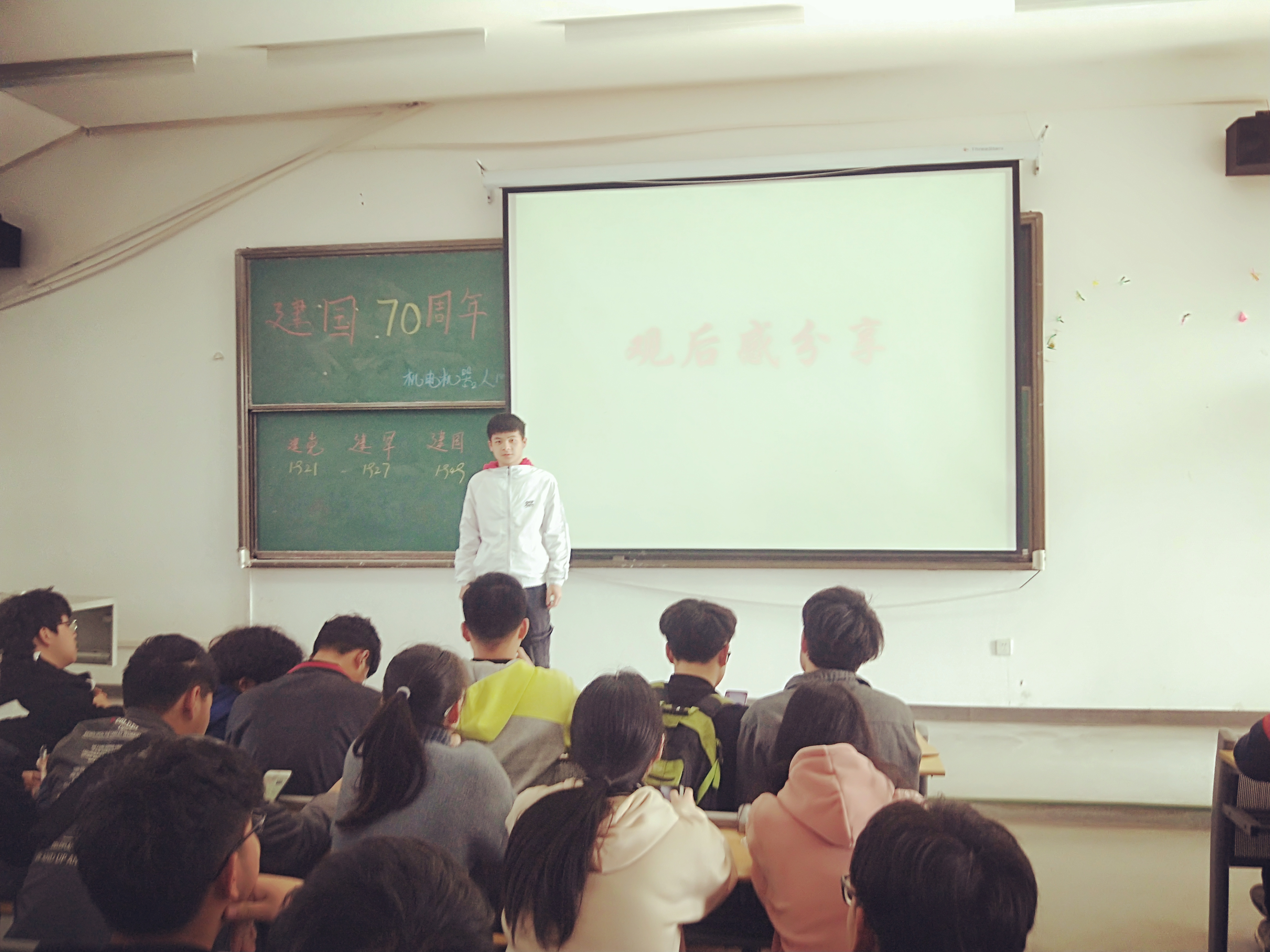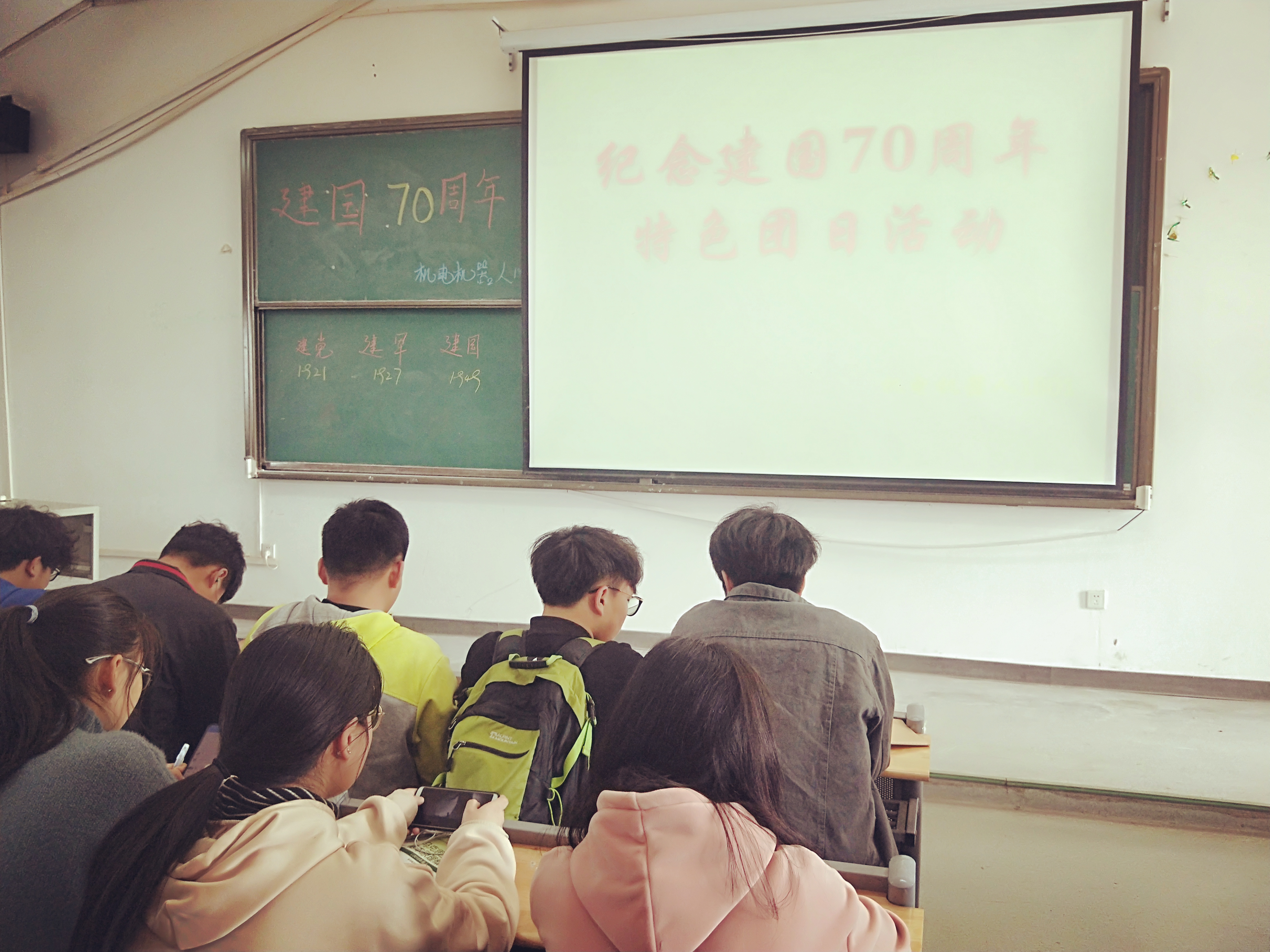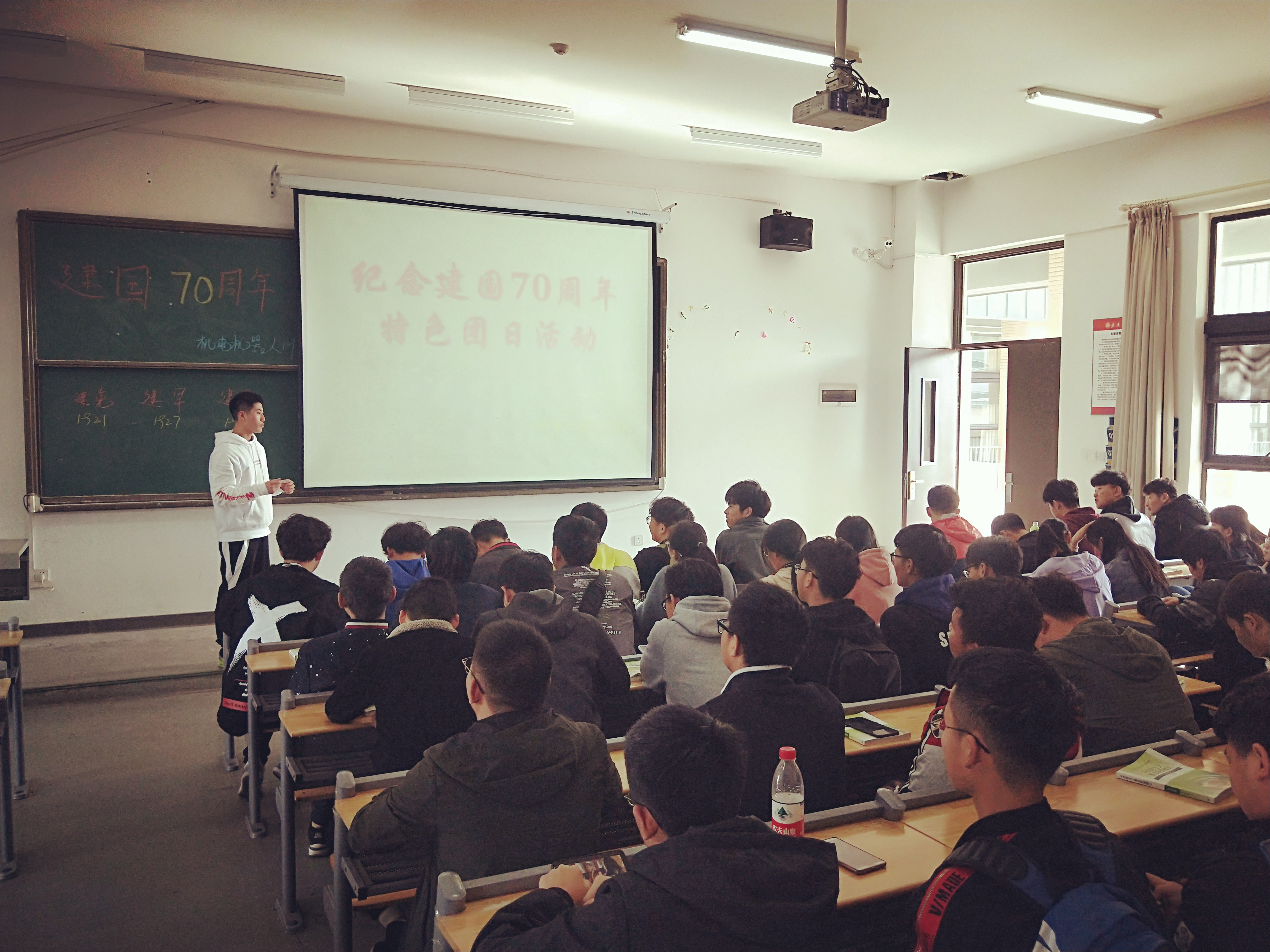 团支书祁家骅在前期组织所有的团员观看建党大业、建国大业以及建军大业三部大片,让同学们充分回顾了历史,感悟建国之艰辛,中国共产党之伟大。建国七十年,这是一个值得庆祝的时间,也是一个不断向前的节点。七十年努力拼搏,七十年沧桑巨变。这七十年里,中国经济蓬勃发展;这七十年里,使人民生活安居乐业。展望未来,我们有理由相信,中国的明天会更好,我们的生活会越来越富足!