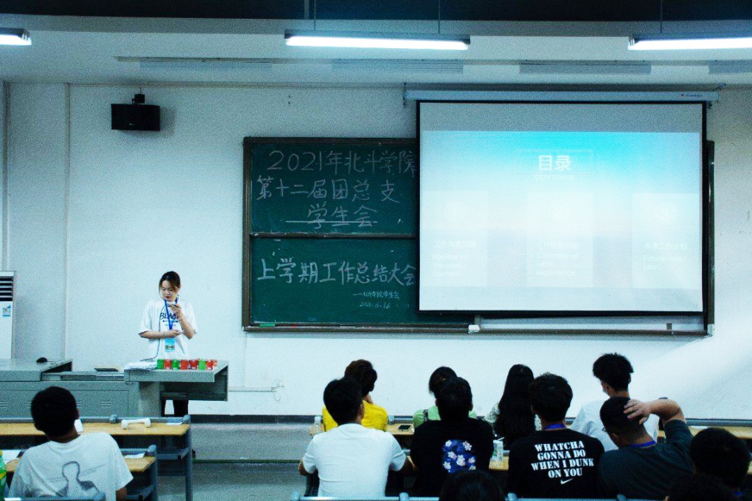 大会第一项,由各部门干事先做工作总结,概述自己这学期的工作内容,反思自己存在的不足,并对未来做出计划安排,之后再由各部门部长对部门工作和干事的表现做出总结发言。