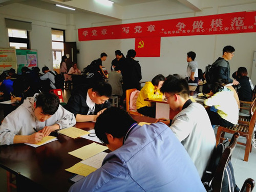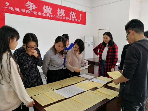 比赛分初赛和决赛,经初选,37名员工入围决赛,决赛于3月28日在综一203举行,党总支组织员张丽芳老师就举行本次活动的目的发表了讲话,她说希望大家以书法大赛为契机,认真学习党章,践行党章,以党员的标准严格要求自己,坚定不移跟党走,坚持道路自信、理论自信、制度自信和文化自信。电机学院副经理杨玖炼老师和辅导员老师们担任了评委。