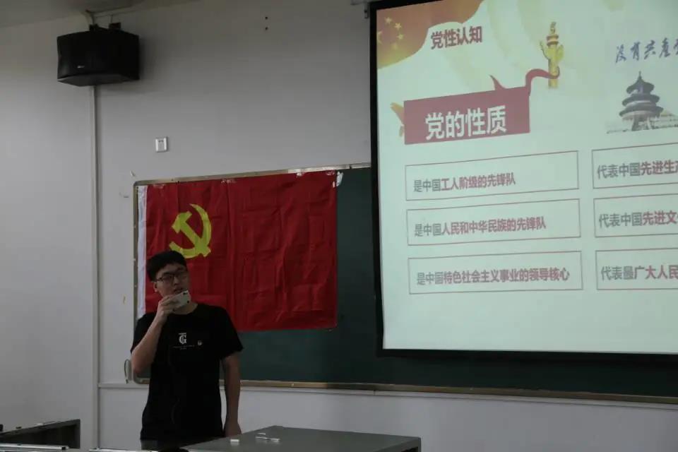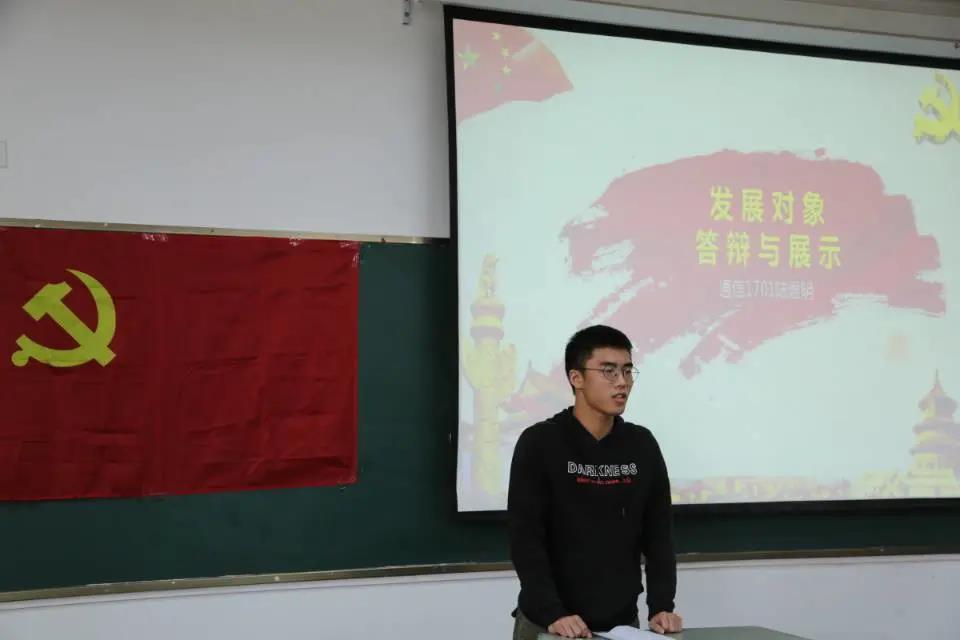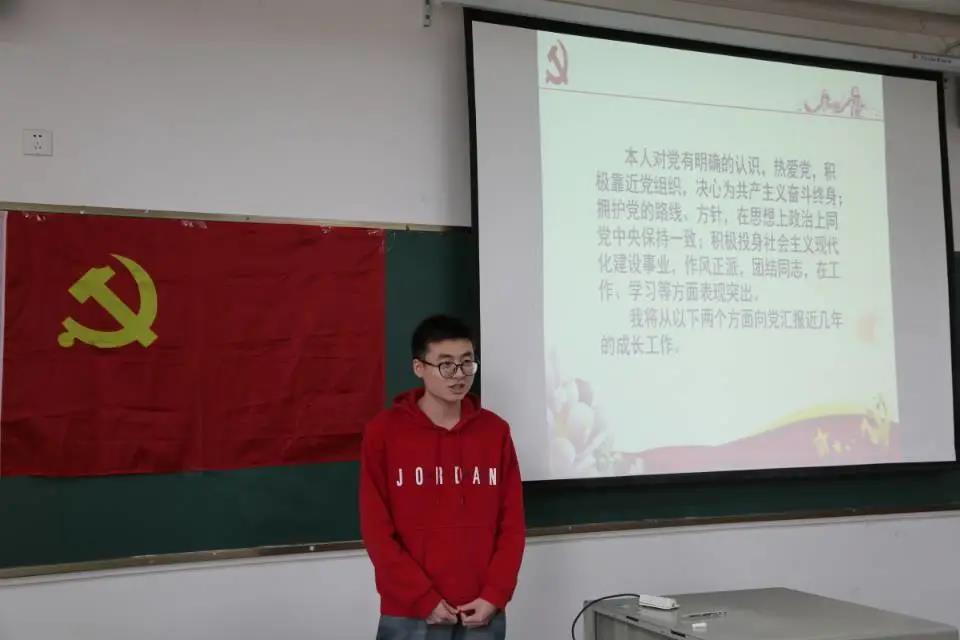 会议第二项议程:由党员发展候选人何蕴哲、刘子琪、周萱、陆煜明、叶铖、张洲杰、蒋康、简开智等8名同学,借助PPT对个人情况与思想状况进行汇报。图为部分候选人正在做思想汇报。