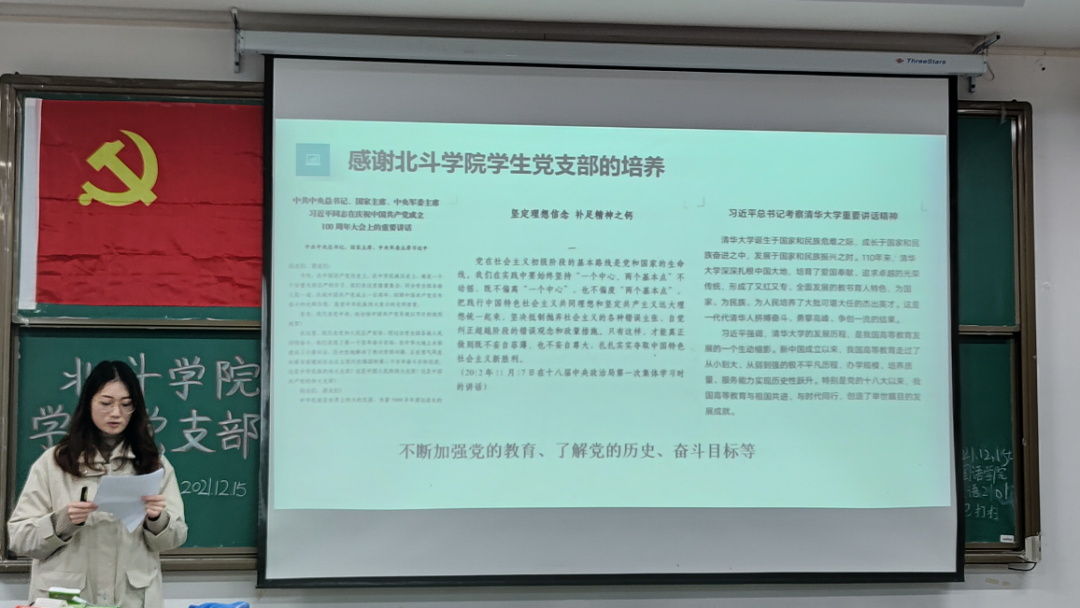 第二位汇报人江文创同志。该同志分享了其拾金不昧毫不迟疑上交的事迹;在学习生活上,积极交流,努力学习,为北斗足球队贡献出他的力量;身为团支书,以身作则,带领同学们学习。最后他表示要从自身做起,要提高为人民服务的本领。