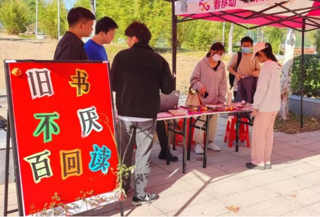 为了提高员工们对活动的兴趣和参与度,大家动手利用校园里颜色形状各异的落叶作为素材来制作宣传海报和各种可爱精美的纪念品,赠与参与活动的同学。自己动手,一来提升了大家的参与感,二来贯彻和传递绿色环保的理念。2022年10月12日早上8点,各类物资准备就绪后,本次活动正式开启。大家以“以书换书,以书会友”为主题概念对同学们讲行详细讲解后,过往同学对活动颇感兴趣,同学们纷纷带上自己已闲置的书籍进行置换,并领取自己中意的纪念品同时和周围同学讨论读书的乐趣。“通过图书交换,能让自己闲置的图书被利用起来,不但节省购书成本,而且还实现了资源利用的最大化,一举多得”——是众多同学们对我们此次活动的评价。