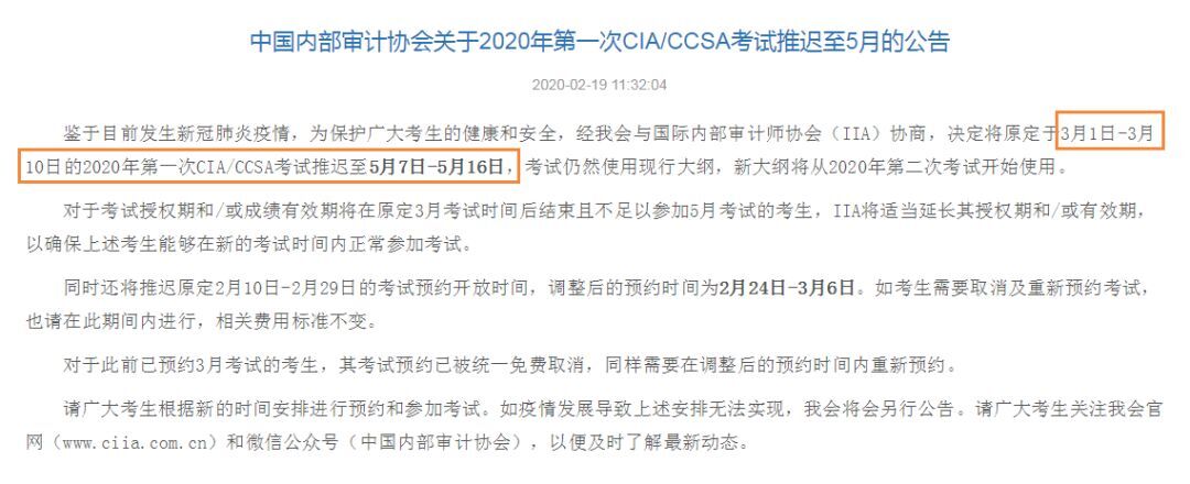 原定于3月1日-3月10日的2020年第一次CIA/CCSA考试推迟至5月7日-5月16日。