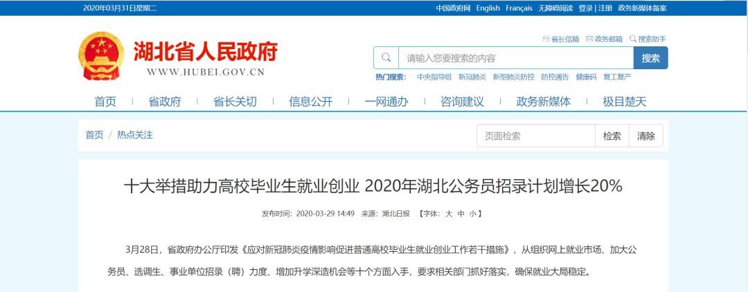 湖北公务员招录计划增加20%。当然,各位考生也要有充分的思想认识,即使2020年公务员招录人数(联考、省考、国考)增加20%,也不意味着可以公考轻松上岸了。首先,2020年普通高校毕业生大幅增长,比2019年增加了40万人。