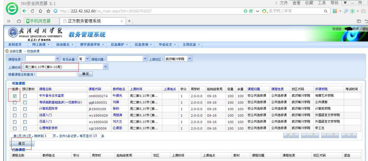 Step2:面授课程可按“上课时间”选课,勾选与班级课表不冲突的上课时间对应的课程,点击“提交”按钮,出现在“已选课程”方框中即可。