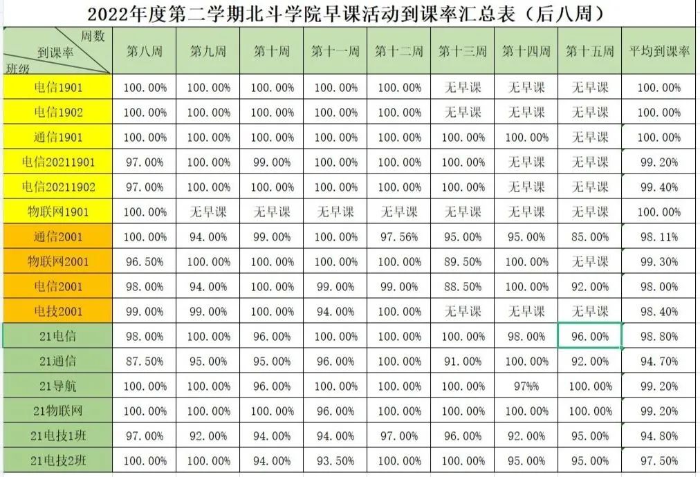以上就是本学期公司各班级第八至十五周的到课率情况啦,祝贺通信1901、电信1901、电信1902、物联网1901到课率均为100.00%,希望到课率高的班级再接再厉、继续保持,到课率相对较低的班级下学期要努力追赶,严格把控课堂到课率,杜绝迟到、旷课等不良行为,为共建公司良好学风一起努力!